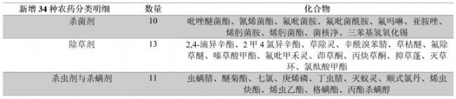 新增 34 種農(nóng)藥及11種代謝物共計45種。