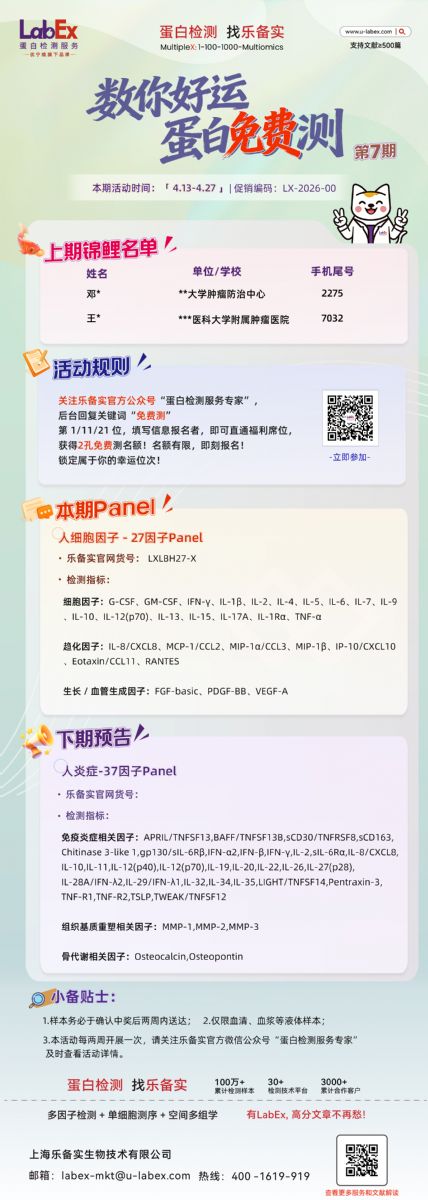 樂備實(shí)(上海優(yōu)寧維生物科技股份有限公司旗下全資子公司),是國內(nèi)專注于提供高質(zhì)量蛋白檢測(cè)以及組學(xué)分析服務(wù)的實(shí)驗(yàn)服務(wù)專家,自2018年成立以來,樂備實(shí)不斷尋求突破,公司的服務(wù)技術(shù)平臺(tái)已擴(kuò)展到單細(xì)胞測(cè)序、空間多組學(xué)、流式檢測(cè)、超敏電化學(xué)發(fā)光、Luminex多因子檢測(cè)、抗體芯片、PCR Array、ELISA、Elispot、PLA蛋白互作、多色免疫組化、DSP空間多組學(xué)等30多個(gè),建立起了一套涵蓋基因、蛋白、細(xì)胞以及組織水平實(shí)驗(yàn)的完整檢測(cè)體系。