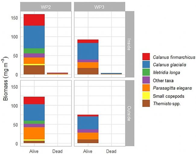 圖4 羽流內外活體與死亡浮游動物生物量對比