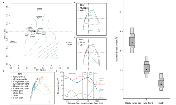 圖5 浮游動物群落組成隨距冰川距離的變化;穩(wěn)定同位素生態(tài)位寬度(冰川灣、峽灣中部、陸架三組對比)