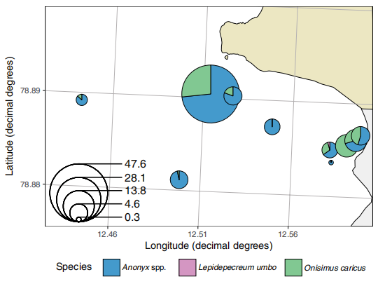 在冰川灣布設的誘捕器捕獲了大量底棲食腐端足類,其捕獲量在羽流外圍區(qū)域最高(每日每陷阱可達50只,圖6)。這些底棲生物依賴于從表層沉降的死亡浮游生物及海鳥排泄物,形成了高效的碳匯鏈路。