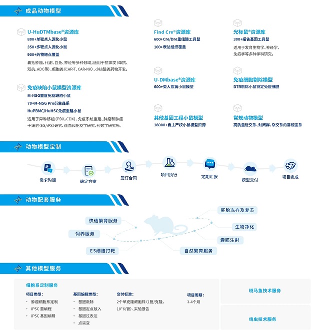 南模生物擁有經(jīng)驗(yàn)豐富的模型定制團(tuán)隊(duì),可為客戶定制敲除、條件性敲除、點(diǎn)突變、人源化、敲入等多種類型的基因編輯小鼠。此外,南模生物擁有含上萬種成品小鼠的模型資源庫,基本覆蓋熱門基因的敲除/條件性敲除小鼠、免疫缺陷小鼠、靶點(diǎn)人源化小鼠、自發(fā)疾病小鼠、Cre/Dre 工具鼠、熒光示蹤小鼠等。