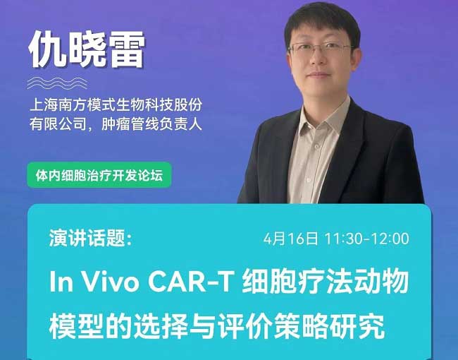 作為本次盛會(huì)的參展單位,南模生物將亮相B03展臺(tái),恭候各位專家同仁蒞臨交流。在體內(nèi)細(xì)胞治療開發(fā)論壇的演講環(huán)節(jié),南模生物工業(yè)客戶部腫瘤管線負(fù)責(zé)人仇曉雷博士將于4月16日 11:30-12:00帶來題為《In vivo CAR-T細(xì)胞療法動(dòng)物模型的選擇與評(píng)價(jià)策略研究》的主題報(bào)告,聚焦體內(nèi)CAR-T細(xì)胞療法研發(fā)難點(diǎn),分享模型在藥效驗(yàn)證、安全性評(píng)估及臨床轉(zhuǎn)化中的關(guān)鍵應(yīng)用,為細(xì)胞治療藥物研發(fā)提供實(shí)驗(yàn)支撐與實(shí)踐參考。
