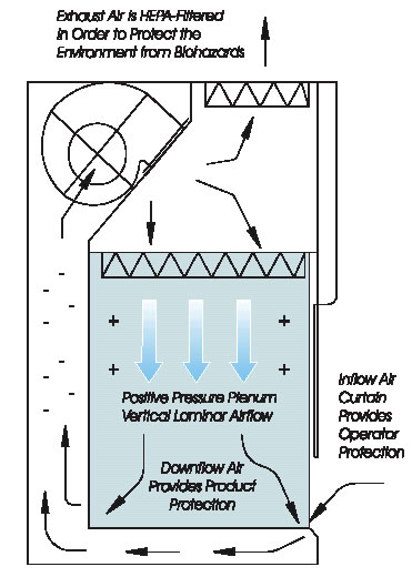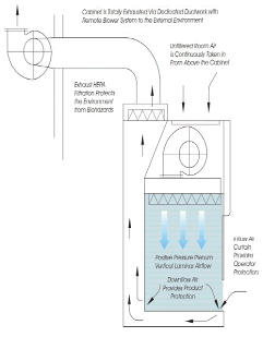 一級生物安全柜只保護(hù)工作人員和環(huán)境而不保護(hù)樣品。氣流原理和實驗室通風(fēng)櫥一樣,不同之處在于排氣口安裝有HEPA(高效空氣粒子過濾器)過濾器。由前窗操作口向內(nèi)吸入的負(fù)壓氣流保護(hù)人員的安全,而排出的氣流須經(jīng)HEPA過濾來保護(hù)環(huán)境不受污染。一級生物安全柜由于不能保護(hù)柜內(nèi)產(chǎn)品,目前已較少使用。