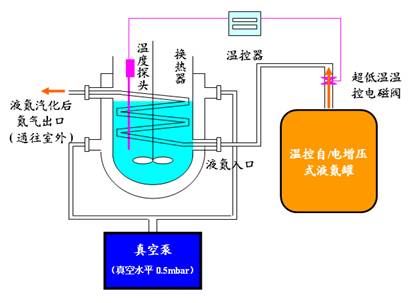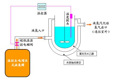 國內(nèi)超低溫反應(yīng)器的應(yīng)用目前主要用體現(xiàn)在合金(鈦合金、奧氏體不銹鋼等)反應(yīng)釜上,在玻璃反應(yīng)器方面,目前筆者所在公司已進(jìn)行了系統(tǒng)的探索并率先推出了產(chǎn)品。要經(jīng)濟(jì)的實(shí)現(xiàn)超低溫環(huán)境,肯定不應(yīng)該選擇兩級或三級以上的多級壓縮機(jī)制冷設(shè)備,鑒于液氮的使用成本不到2元/公斤,無論在實(shí)驗(yàn)中還是在生產(chǎn)上,這種制冷方式得到大多數(shù)用戶的歡迎。但由于液氮沸點(diǎn)低(-195.8℃)、潛熱小、極易蒸發(fā)。要安全,經(jīng)濟(jì)地貯存、輸送和應(yīng)用液氮,必須要有絕熱性能良好的貯存和應(yīng)用設(shè)備。市場上液氮相關(guān)設(shè)備及管道配件大多采用英國人詹姆斯杜瓦發(fā)明的雙層壁真空容器結(jié)構(gòu)。而影響這種真空容器及配件性能的關(guān)鍵因素是夾層真空度。而且液氮的使用對反應(yīng)器控溫方式、保溫措施、材料性能、設(shè)備密封與壓力控制以及使用環(huán)境安全性措施等方面都提出了較高的要求。使用液氮制冷的玻璃反應(yīng)器仍然必須保留反應(yīng)過程透明可見的優(yōu)點(diǎn)。而且液氮具有健康危害性:皮膚接觸液氮可致凍傷。如在常壓下汽化產(chǎn)生的氮?dú)膺^量,可使空氣中氧分壓下降,引起缺氧窒息。我們開發(fā)出的超低溫控制設(shè)備可以分別用在單夾套與雙夾套的玻璃反應(yīng)器中,原理示意圖如下: