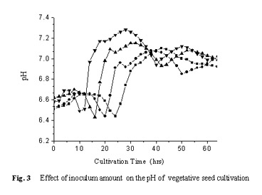 由Fig. 3可見(jiàn)幾種不同接種量的種子培養(yǎng)過(guò)程的pH曲線的變化趨勢(shì)基本一致(2%接種量時(shí),在圖示范圍內(nèi)pH沒(méi)有出現(xiàn)第二個(gè)低谷),不同之處在于形成峰值和低谷值的時(shí)間不同,說(shuō)明這幾種情況下菌體的生理代謝過(guò)程相似,即接種量沒(méi)有超出正常范圍。當(dāng)接種量太小或太大時(shí)種子培養(yǎng)過(guò)程的pH曲線同F(xiàn)ig. 3相比已發(fā)生較大變化(數(shù)據(jù)略)。