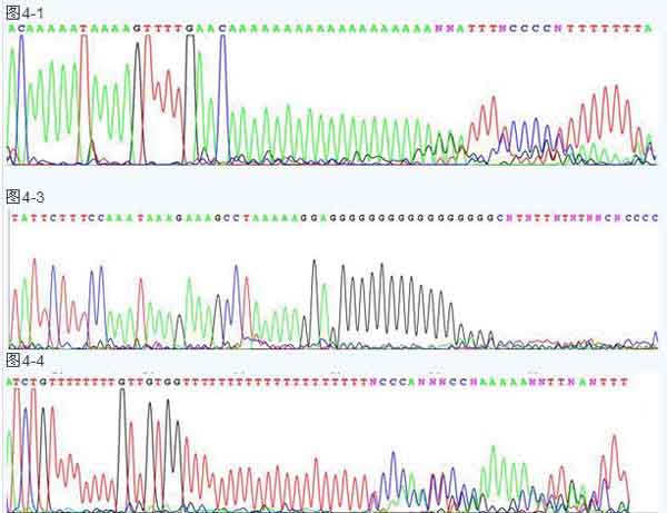RACE 測序時經(jīng)常遇到圖4-1 和圖4-4 的情形,解決方法:從另一端測序;但如果這樣的序列出現(xiàn)在中間,目前還沒有很好的解決方法,要看測序公司的本事了。