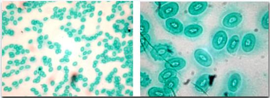 DNA和RNA的顯示結(jié)果(左圖×100,右圖×400)