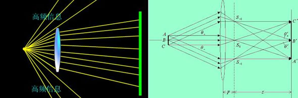 由阿貝的觀點(diǎn)來看:許多成像光學(xué)儀器就是一個(gè)低通濾波器,物平面包含從低頻到高頻的信息,透鏡口徑限制了高頻信息通過,只許一定的低頻通過,因此,丟失了高頻信息的光束再合成,圖象的細(xì)節(jié)變模糊. 孔徑越大,丟失的信息越少,圖象越清晰.