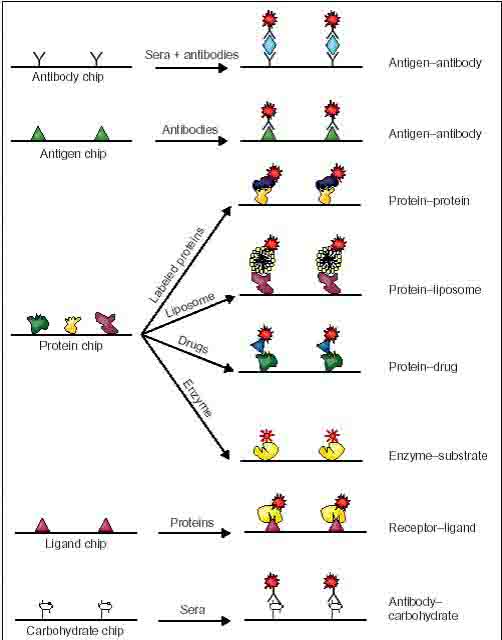 蛋白芯片與基因芯片的原理相似。不同之處有,一是芯片上固定的分子是蛋白質(zhì)如抗原或抗體等。其二,檢測的原理是依據(jù)蛋白分子、蛋白與核酸、蛋白與其它分子的相互作用。