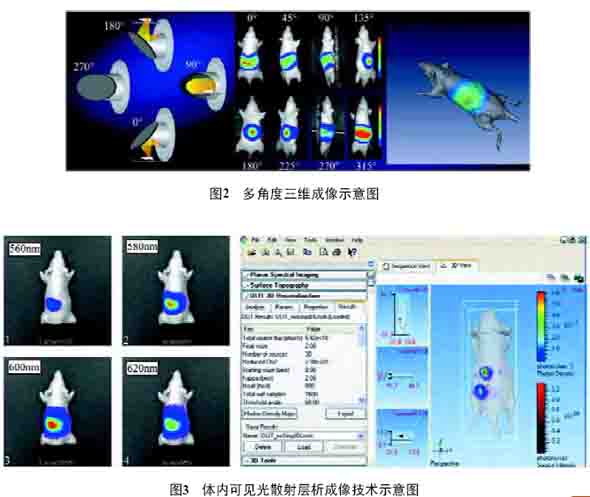 1.1 多角度掃描技術(shù) 多角度掃描技術(shù)是比較傳統(tǒng)的三維成像技術(shù), 也是研究人員比較熟悉的一個(gè)技術(shù)。該技術(shù)的原理與CT 及PET 等其他三維成像技術(shù)很類(lèi)似。它對(duì)小鼠不同的角度進(jìn)行二維成像,然后將這些不同角度的二維圖像用軟件合成構(gòu)建成三維圖像(圖2)。