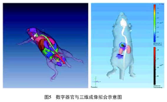 通過(guò)DLIT 和FLIT技術(shù)可以獲得動(dòng)物生物發(fā)光和熒光的三維成像圖,這一結(jié)果是基于和拓?fù)浔砻鎴D像結(jié)合的結(jié)果,并沒(méi)有與動(dòng)物體內(nèi)的器官建立相對(duì)應(yīng)的關(guān)聯(lián)。為了能夠更準(zhǔn)確地定位信號(hào)源在體內(nèi)所在的器官,使用不同斷層的病理切片和小鼠不同姿勢(shì)的CT 圖譜,建立了數(shù)字化的小鼠器官圖。可以將計(jì)算好的三維成像圖與器官圖進(jìn)行擬合,用以確定信號(hào)所在的器官位置(圖5)。這種方法的局限在于所有的三維成像圖都和相同的數(shù)字器官圖擬合,僅在動(dòng)物體表面積上有所變化。隨著軟件的進(jìn)一步發(fā)展,可以把三維成像圖與真實(shí)老鼠的CT、MRI 所獲得結(jié)構(gòu)性成像疊加,獲得特異性更強(qiáng)的結(jié)果。XENOGEN 公司的IVIS 200 及IVIS Spectrum采用了此種方法進(jìn)行三維成像圖和器官圖的擬合。