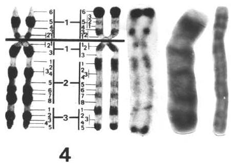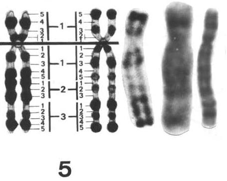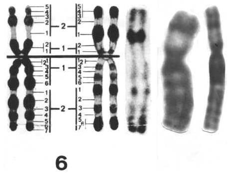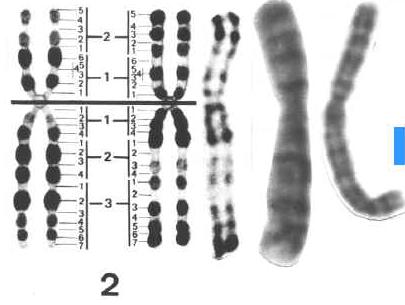• 短臂:近側(cè)段和中段各有一條深帶,其中段深帶稍寬,在處理較好的標(biāo)本上,遠(yuǎn)側(cè)段可顯出2-3條淡染的深帶。此臂分為3個(gè)區(qū),近側(cè)的深帶為2區(qū)1號(hào)帶,中段深帶為3區(qū)1號(hào)帶。