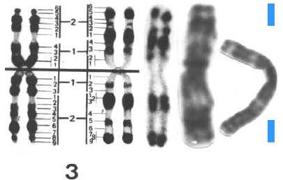 • 短臂: 一般在近側(cè)段可見(jiàn)兩條深帶,遠(yuǎn)側(cè)段可見(jiàn)3條深帶,其中遠(yuǎn)側(cè)近端部的一條較窄,且著色較淡,這是區(qū)別3號(hào)染色體短臂的顯著特征。此臂分為2個(gè)區(qū),中段淺帶為2區(qū)1號(hào)帶。