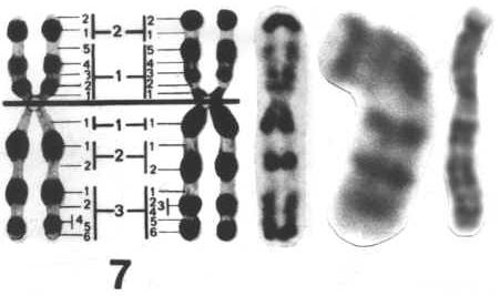 • 短臂: 有3條深帶,中間的一條深帶窄而且著色極淡,有時(shí)不明顯,遠(yuǎn)側(cè)近末段的深帶著色濃而稍寬,宛如“瓶蓋”,這常常是辨別7號(hào)染色體的明顯特征。此臂分為2個(gè)區(qū),遠(yuǎn)側(cè)深帶為2區(qū)1號(hào)帶。