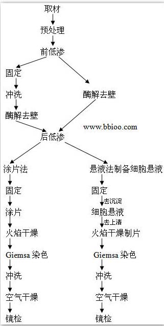 (1)固定:將后低滲好的材料,直接用甲醇:冰醋酸(3:1)固定液固定30分鐘以上