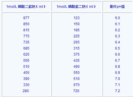 按照下表所給定的體積,混合1 mol/L 的磷酸二氫鈉(單堿)和1mol/L 磷酸氫二鈉(雙堿)貯液,獲得所需pH的磷酸緩沖液。配制1 mol/L