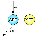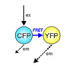 CFP(供體)受到激發(fā),但是大多數(shù)能量不會(huì)引起青綠色放射體;而是被傳送到Y(jié)FP(受體);因此,所產(chǎn)生的放射體主要是黃色的。
