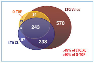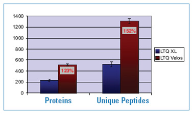 • 在一個復雜混合樣品中, LTQ Velos 離子阱比四級桿 - 飛行時間質譜能多鑒定 240% 個蛋白質和 130% 個特異性肽段,而且,通過四級桿 - 飛行時間質譜鑒定到的蛋白,有 90% 以上都能在 LTQ Velos 看到。