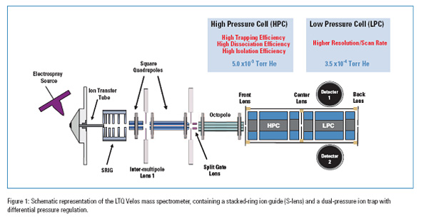 在本篇文章主要測試Thermo Scientific 的LTQ Velos離子阱質譜儀。它包括了一個新型雙壓線性離子阱和高壓環(huán)形離子導入裝置(S-Lens),如圖1所示。
