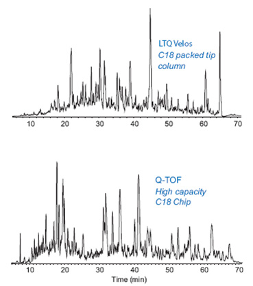 為了比較和評估性能,在 Thermo Scientific 的 LTQ XL 線性離子阱質譜儀和安捷倫 6520 四級桿 - 飛行時間質譜儀一級 LTQ Velos 雙壓線性離子阱質譜儀對 C.elegans 的蛋白酶解物進行了分析,肽段混合物是在反相色譜進行分離的。詳細的色譜條件請參照表 1 。同時對減少進樣量進行了考察。