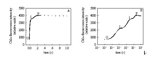 圖2 用連續(xù)激發(fā)式熒光儀測(cè)定的快速葉綠素?zé)晒庹T導(dǎo)動(dòng)力學(xué)曲線(xiàn)(圖A: 時(shí)間坐標(biāo)為線(xiàn)性形式;圖B: 時(shí)間坐標(biāo)為對(duì)數(shù)形式)
