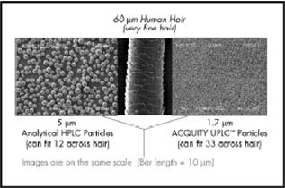 研制并填充2 μm以下的顆粒至可重現(xiàn)而耐用的色譜柱中本身就是一個(gè)挑戰(zhàn)。圖4顯示出了目前實(shí)驗(yàn)室常用的5 μm顆粒與建議用于UPLC柱的更小的1.7 μm顆粒的明顯差異。目前,非多孔型1.5 μm顆粒已經(jīng)上市。雖然這類顆粒效率較高,但它們的缺點(diǎn)是表面積較小。表面積小會(huì)導(dǎo)致載樣量小和保留時(shí)間短。為了與HPLC保持相近的保留時(shí)間和載樣量,UPLC必須使用多孔型顆粒。UPLC需要一種新穎的耐高壓多孔型顆粒。填充床的均勻性也是至關(guān)重要的;特別是當(dāng)較短的色譜柱用以保持分辨率的穩(wěn)定,而同時(shí)又要達(dá)到加快分離速度的目標(biāo)時(shí)。另一項(xiàng)要求是色譜柱的內(nèi)表面必須足夠光滑,以便于填充較小顆粒。應(yīng)重新設(shè)計(jì)色譜柱兩端的篩板,使之既能留住小顆粒又能避免堵塞。