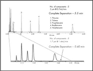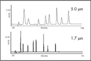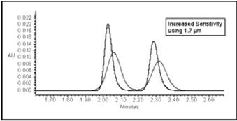 圖2:比較5 μm顆粒與1.7 μm顆粒。峰容量和分辨率顯著增加。