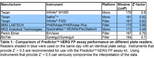 目前市場上多款酶標(biāo)儀都可以用來做熒光偏振檢測,Invitrogene公司專門利用Predictor™ hERG對多款酶標(biāo)儀進(jìn)行熒光偏振測試分析(表1)。