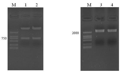 M:DL2000 1,2:pVax-DsRed-IRES-EGFP經(jīng)NsiI,BsshII雙切 3,4:pVax-DsRed-IRES-EGFP經(jīng)BamHI,XhoI雙切