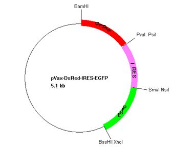 圖1 重組質(zhì)粒pVax-DsRed-IRES-EGFP片段及酶切位點(diǎn)圖譜