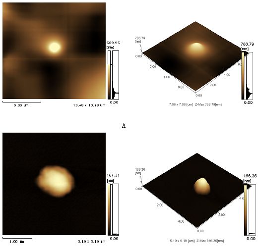 對于亞精氨、氯化鈣沉淀法制備基因槍子彈的金顆粒與DNA的結(jié)合方式問題,國內(nèi)外文獻(xiàn)均沒有明確報(bào)道,本文為了弄清楚上述問題,將亞精氨-氯化鈣沉淀法制備的金顆粒-質(zhì)粒DNA乙醇溶液稀釋100倍,點(diǎn)樣至云母上,進(jìn)行原子力顯微鏡掃描,顯示DNA能夠有效包裹在金顆粒上,掃描結(jié)果如圖3。