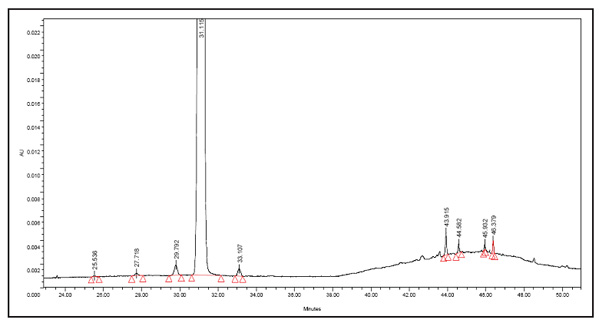 分析型 HPLC 經(jīng)常采用 4.6 毫米 x 150 毫米 或 250 毫米 的色譜柱,填充物質(zhì)的粒度為 3.0~5.0 微米,工作流速為 1.0~1.4 毫升 / 分鐘。這樣,每個(gè)樣品的 HPLC 分析時(shí)間便是 15~60 分鐘。典型的批量需要 10~20 小時(shí)完成,分析結(jié)果在第二天之前無法用于批簽發(fā)、下一個(gè)臨床劑量、工廠的清潔等方面的決策。流速為 1.4 毫升 / 分鐘時(shí),這些 HPLC 系統(tǒng)每 20 小時(shí)日消耗約 1.5 升 溶劑,其中通常包括 50% 的有機(jī)溶劑。這些溶劑必須外購并棄置,這一切都會增加總體分析的成本。在平均 250 日的工作年中,最多會增加近 200 升 的有機(jī)溶劑;購買每升乙腈的約需 100 美元,相當(dāng)于 20,000 美元的可消耗成本。鑒于近期乙腈成本的增加以及全球某些地區(qū)的缺貨現(xiàn)狀,非常需要更加高效地利用該有毒溶劑。圖 1 所示為 HPLC 在制藥工業(yè)的一個(gè)應(yīng)用實(shí)例 – 奎硫平雜質(zhì)分析的代表性樣品圖譜;從圖中可見,梯度分析時(shí)間為 51 分鐘,色譜柱重新平衡需要 16 分鐘。