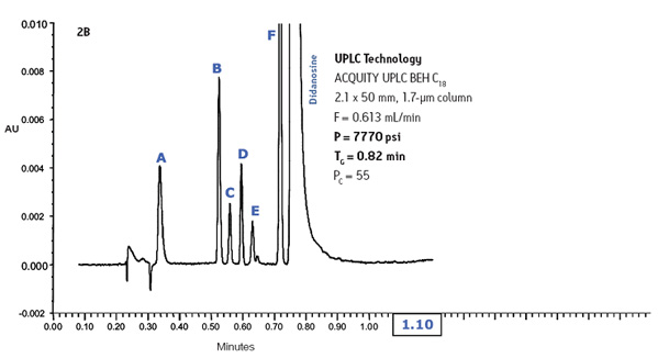 圖 2 地達(dá)諾新及其雜質(zhì)的 HPLC 與 UPLC 分離(標(biāo)為 A-F )。 2A . 5.0 微米粒度的 HPLC 分離。 2B. 1.7 微米粒度的 UPLC 分離。