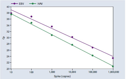 圖4: 線性范圍。 每份樣品中加樣濃度為10-106拷貝的Epstein-Barr病毒(EBV)DNA和甲型肝炎病毒RNA的分離。