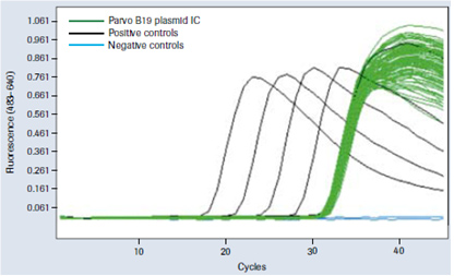 MagNA Pure 96系統(tǒng)能在每次分離反應(yīng)中都包括一次內(nèi)部質(zhì)控(IC)。 IC從機(jī)載IC管中自動移入每個孔中的溶解緩沖液中。在一次純化操作的所有96個孔中,采用稀釋的細(xì)小病毒B19質(zhì)粒作為IC,陰性血清作為樣品材料來檢查該功能。 IC的分離具有很高的可重復(fù)性(圖5)。