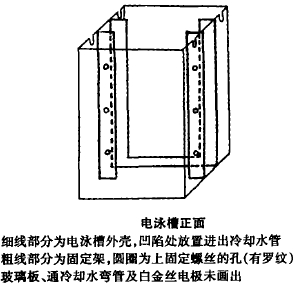 電泳槽的式樣見附圖。整個(gè)槽由有機(jī)玻璃粘合而成,外殼為一個(gè)矩形槽,大小為90×150×230cm(可根據(jù)需要適當(dāng)縮小),中間設(shè)置一個(gè)固定架,用以固定玻璃板并分隔電泳槽為正負(fù)極。固定架的具體構(gòu)造是:在短形槽的左右兩側(cè)壁中部的全長(zhǎng)上,各粘合兩片寬20mm、長(zhǎng)230arm、厚5mm以上的有機(jī)玻璃片,兩片相距20mm。前面兩片各鉆三個(gè)有羅紋的孔,后面兩片的底部由一高15mm的有機(jī)玻璃長(zhǎng)條相連,成一整塊,呈u形,且與槽底牯合,不漏液體。