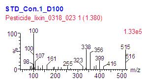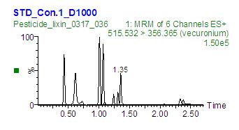 下圖 3 中,是 維庫溴銨 515.5>356.4 離子對采集的 MRM PICS 掃描色譜圖,在該 MRM 色譜圖中提取了 1.36min 時間處的 PICS 質(zhì)譜圖(下圖 4 ),與 維庫溴銨標(biāo)準(zhǔn)品 PICS 質(zhì)譜圖或 MRM 方法比對, 即可判斷該峰為 維庫溴銨。