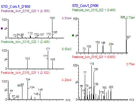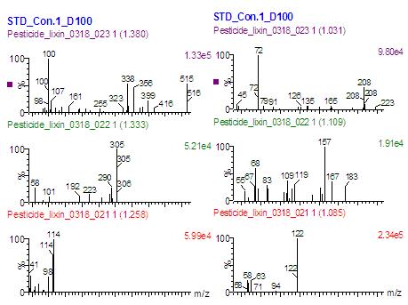 在各個農(nóng)藥標(biāo)準(zhǔn)品的 MRM 圖中,得到在過峰頂點處的 PICS 掃描圖,根據(jù)分析物的母離子和子離子,很容易定性判斷所對應(yīng)的峰為何種農(nóng)藥。