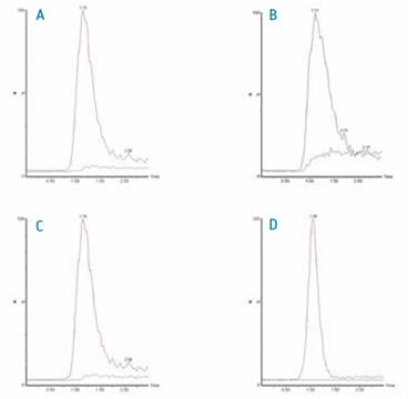 圖 1. 牛奶 (A)/ 嬰兒奶粉 (B)/ 巧克力 (C) 以及餅干 (D) 中的三聚氰胺 (m/z 127 → 60)2.5 mg/kg 處出峰 ( 紫色標(biāo)記 )v.s. 對照 ( 綠色標(biāo)記 ) 。