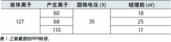 用正位移移液槍將 1 L 牛奶、嬰兒奶粉奶液或巧克力 / 餅干的乙腈萃取液直接加在 ASAP 探針上,探針插入密封放射源內(nèi),去溶劑氣體直線升溫到 400 ° C 。將 ACQUITY TQD 設(shè)定在多反應(yīng)檢測模式 (MRM) 已達(dá)到三次轉(zhuǎn)移,詳見表一。