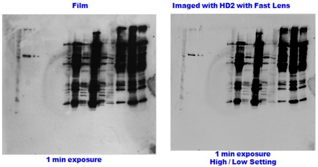 化學(xué)發(fā)光蛋白印記成像和定量分析系統(tǒng)是凝膠成像分析系統(tǒng)的延伸,它的設(shè)計(jì)原理是基于數(shù)字化成像,在特殊設(shè)計(jì)的集成化暗室環(huán)境下,通過調(diào)整鏡頭參數(shù),對(duì)目的物進(jìn)行拍攝。實(shí)際上化學(xué)發(fā)光法蛋白印記成像(Western blotting)通常用來(lái)明確目的蛋白質(zhì)是否存在,換句話講,就是化學(xué)發(fā)光法能夠很好地回答 “有沒有表達(dá)這種蛋白質(zhì)?”。因?yàn)槿搜凼菬o(wú)法有效地分辨出這些信號(hào)的,因此我們需要有一種方法,能夠提供很高的圖像分辨率和很高的靈敏度。以往大家普遍采用的方法是壓片子,認(rèn)為膠片能夠提供給我們相當(dāng)高分辨率和高靈敏度。但是膠片帶來(lái)的高成本和無(wú)法實(shí)時(shí)看到效果,也給我們代理了一些困惑;诖耍蟼(gè)世紀(jì)末開始有頂級(jí)的凝膠成像廠家研究用攝像頭拍攝蛋白印記,但是基于當(dāng)時(shí)的科技水平,效果與膠片總是有那么一點(diǎn)點(diǎn)差距。就在人們對(duì)這項(xiàng)技術(shù)幾乎絕望的時(shí)候,ALPHA的科學(xué)家們發(fā)現(xiàn)如果采用頂級(jí)的航天攝像頭和特殊的鏡頭技術(shù),完全可以超過與替代膠片。