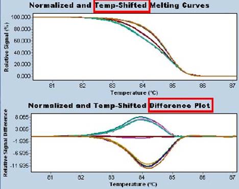 圖:HRM分析 219bp的人類 MBL-2基因片段(384個樣本),結果顯示了四種主要的基因類型(藍色、紅色、綠色和橄欖綠色)和兩個少數(shù)樣本的基因型(橙色和紅紫色)。