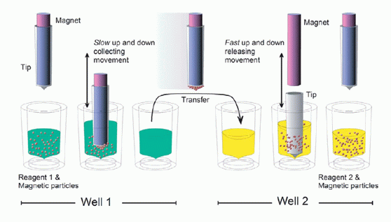 KingFisher系列產(chǎn)品是適于分離DNA/RNA、蛋白和細胞的全自動提取純化系統(tǒng),專為解決客戶現(xiàn)在和未來的所有純化問題而設計。創(chuàng)新的產(chǎn)品基于專利的KingFisher技術(專利號US 6447729, US 6448092),通過特制的磁棒吸附、轉(zhuǎn)移和釋放磁珠,從而實現(xiàn)磁珠/樣品的轉(zhuǎn)移,避免了液體處理過程,提高了自動化程度。KingFisher技術的工作原理如下圖所示,樣品、溶液和磁珠置于微孔板或管中,磁棒表面套有專門的磁套用于保護磁棒避免與樣品/溶液/磁珠直接接觸。