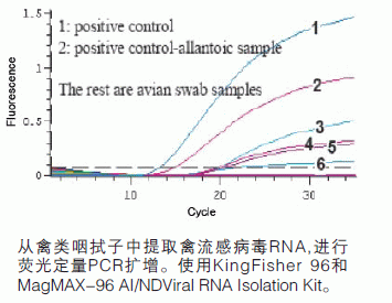 使用專門的KingFisher試劑盒,可高效、高靈敏度地提取禽流感病毒(Avian influenza virus)、新城疫病毒(Newcastledisease virus)、牛病毒性腹瀉病毒(Bovine viral diarrheavirus)、立克次體(Coxiella burnetii)等。KingFisher結合Ambion的MagMAX-96 AI/ND病毒RNA提取試劑盒,應用于禽流感病毒的檢測,是獲得美國農(nóng)業(yè)部(USDA)認可的高通量方法。提取得到的RNA可以通過ABI公司的Infleuenza A/H5 Kit檢測是否含有禽流感病毒,并進一步確認是否是備受關注的H5亞型。