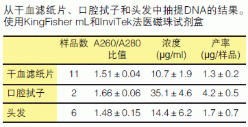 對于法醫(yī)工作而言,核酸提取的效率和穩(wěn)定性都是十分重要的。KingFisher與專門的法醫(yī)樣品核酸提取磁珠試劑配合使用,可從不同來源的材料中純化高質(zhì)量的DNA,包括干血、毛發(fā)、煙嘴等,最大處理量可達96個樣品/每次。