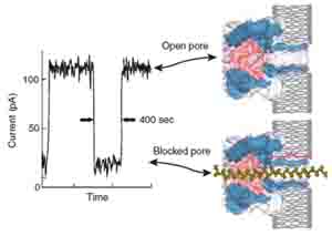 每個(gè)納米微孔的開閉由離子震蕩控制,α-溶血素明確地分辨出微孔是否有DNA分子(圖二 紅色部分)。DNA鏈進(jìn)入微孔的速率由電壓調(diào)節(jié)。