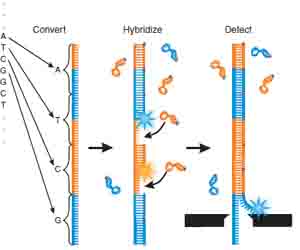 納米孔測序使用DNA合成和光學(xué)識別技術(shù)。目標(biāo)DNA被轉(zhuǎn)化為較長的單鏈,每個(gè)原有的核苷酸被連續(xù)12次復(fù)制到新鏈上。經(jīng)過雜交后形成雙鏈結(jié)構(gòu),進(jìn)入納米孔前,其中一條鏈將被剝離。可用于制作納米孔的材料比如氮化硅的厚度超過DNA分子的10-100倍,這就可能在同一時(shí)間內(nèi)有1個(gè)以上的核苷酸在隧道內(nèi),引起互相干擾無法讀出正確的數(shù)據(jù)。因此有必要在新鏈上多次復(fù)制同一個(gè)核苷酸。