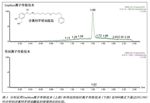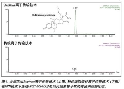 通過(guò)這項(xiàng) StepWave 設(shè)計(jì),根據(jù)所分析的化合物,我們發(fā)現(xiàn)靈敏度竟增加了約 10 ~ 25 倍。例如:治療哮喘和鼻炎的現(xiàn)代藥物(如: β 2 激動(dòng)劑和類(lèi)固醇激素類(lèi)藥物)不會(huì)進(jìn)入到循環(huán)系統(tǒng)且通常都是經(jīng)吸入給藥。這些藥物化合物被有意使得在人體全身系統(tǒng)中以極低濃度水平存在,因此適合使用 Xevo TQ-S 系統(tǒng)進(jìn)行分析。