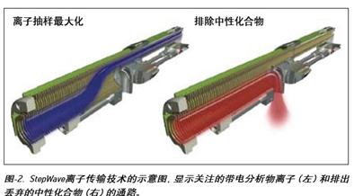 在圖 -2 中,我們可以看到:當(dāng)離子云進(jìn)入 MS 遷移區(qū)時(shí)是如何擴(kuò)散的,而之后當(dāng)其轉(zhuǎn)移到四極桿分析器區(qū)時(shí)又是如何聚集為一狹窄的離子束的。不帶電的中性化合物因無(wú)法穿過(guò)這個(gè)離軸通路而被排出丟棄。這大大提高了檢測(cè)限,使生物分析學(xué)者們可對(duì)血漿、血清和尿液的分析組分在曾經(jīng)無(wú)法達(dá)到的水平下進(jìn)行定量分析。